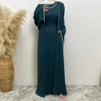 Muslim Women’s Fashion – Sleeveless Dress & Cardigan Set with Chains, Dubai & Turkish Elegant Islamic Wear