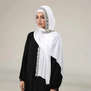 Pearls Embroidery Cotton Jersey Hijab – Long Solid Scarf 170x60cm Head Wrap Shawl Turban for Muslim Women