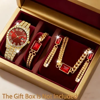 Luxury Full Diamond Women’s Quartz Watch Set – Large Dial Stainless Steel Band Ladies Calendar Wristwatches Jewelry Collection, Reloj Mujer Girls Clock Gift (5PCS, Without Box)