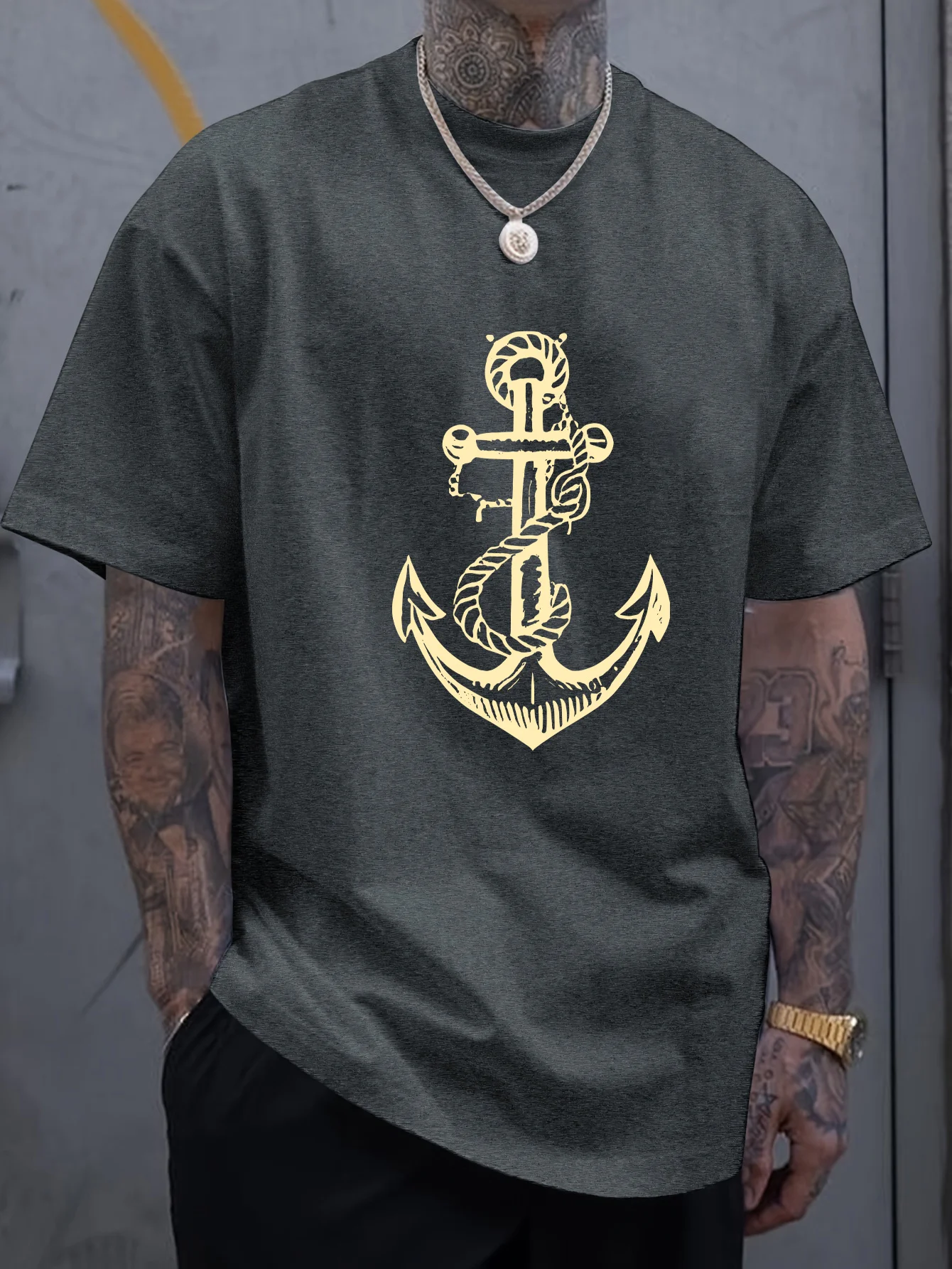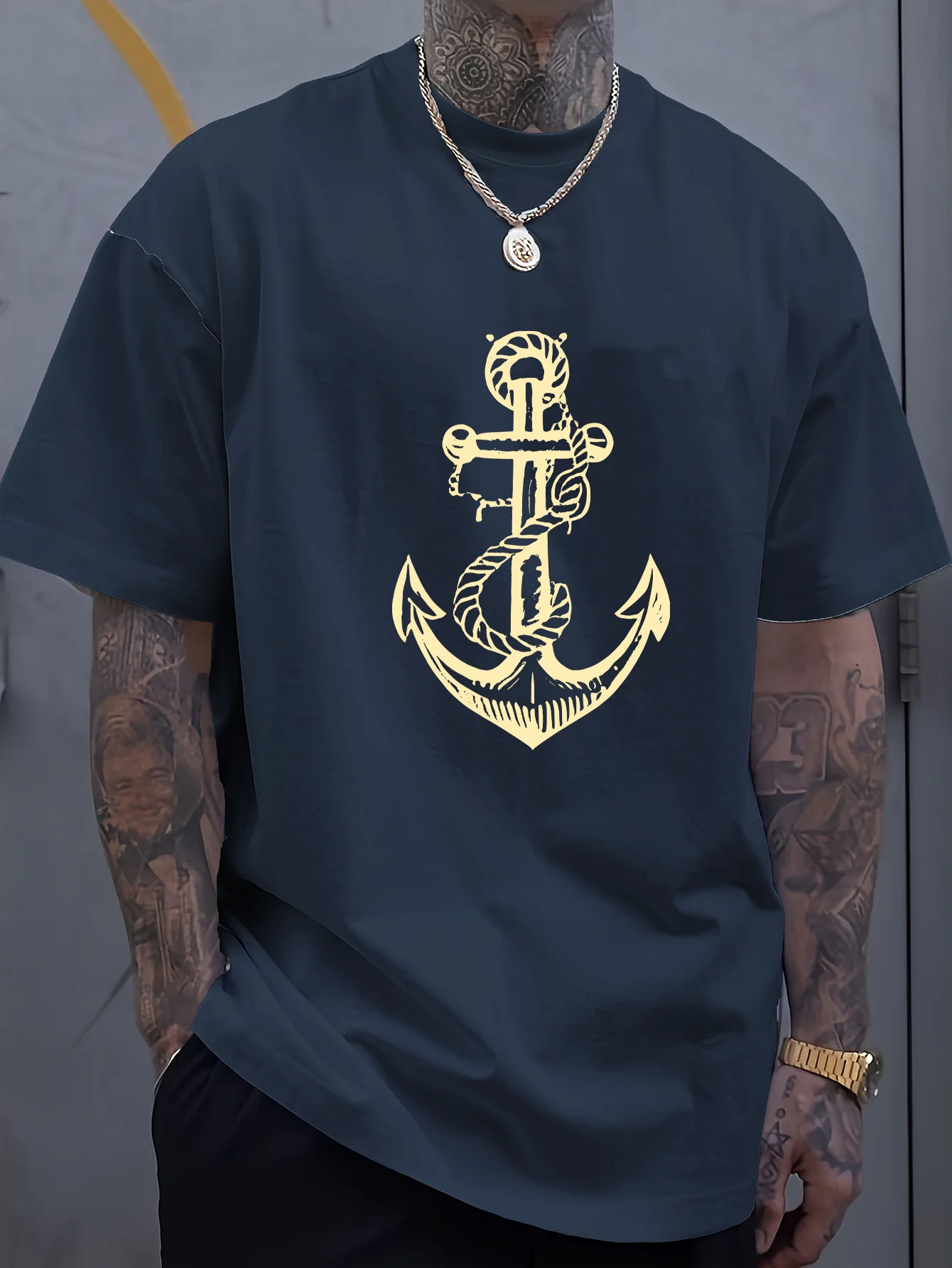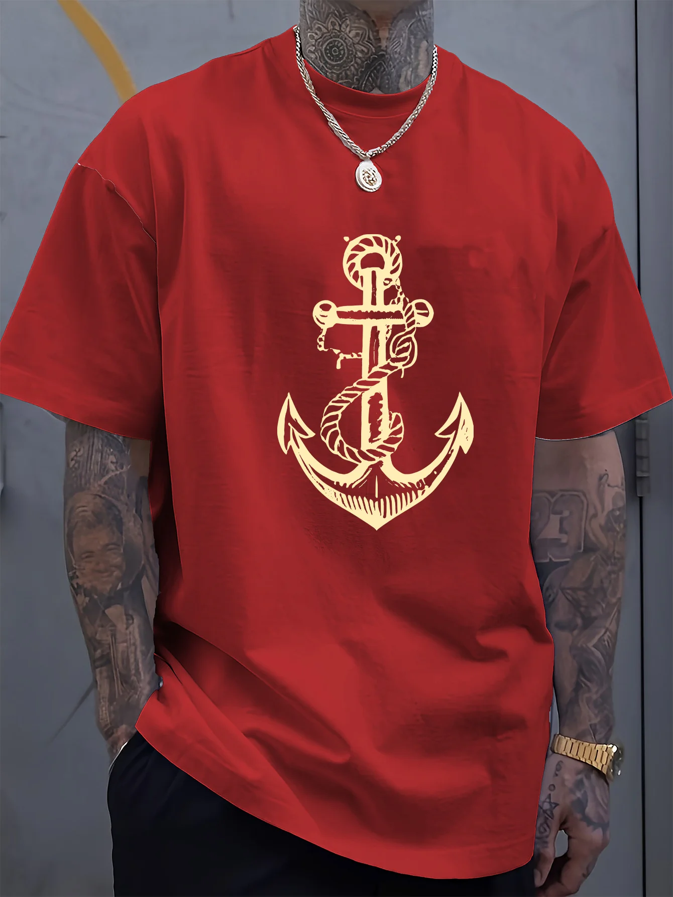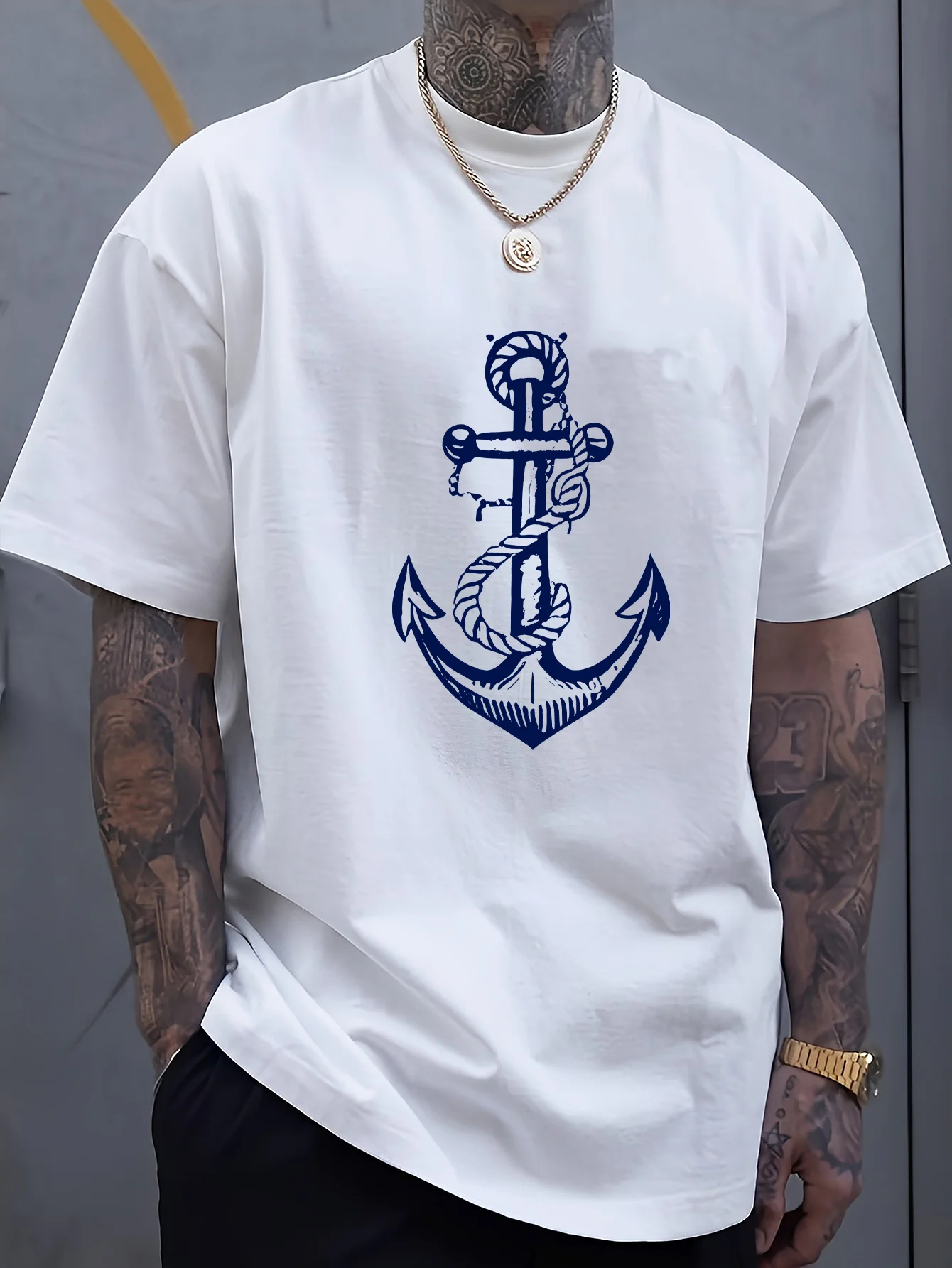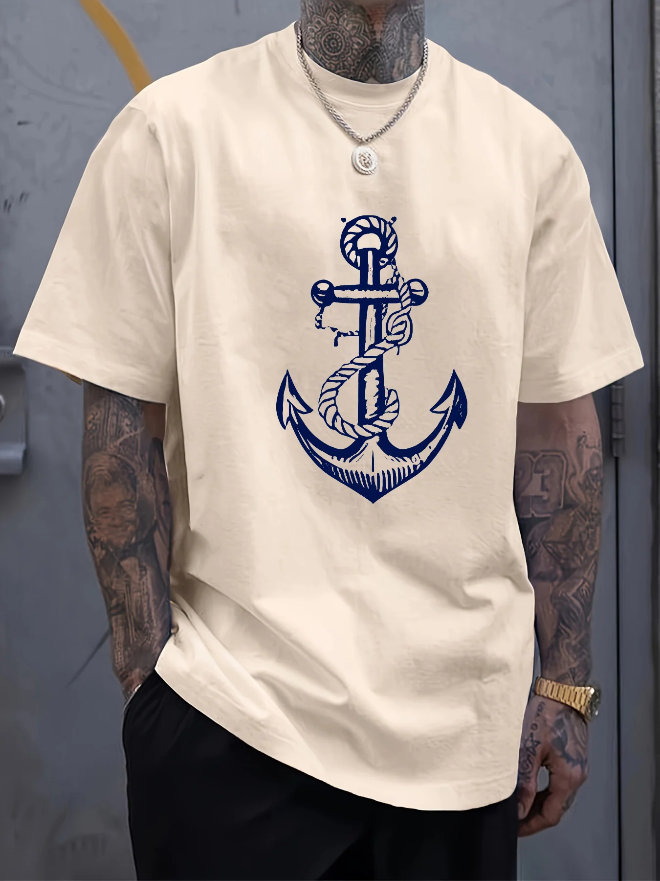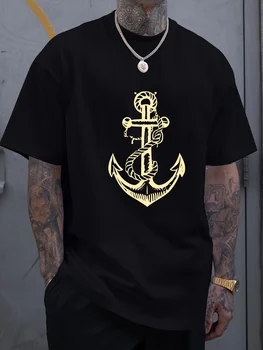 Men’s 100% Cotton Summer T-Shirt – Boat Anchor Print Loose Fit Casual Sports Round Neck Short Sleeve Top